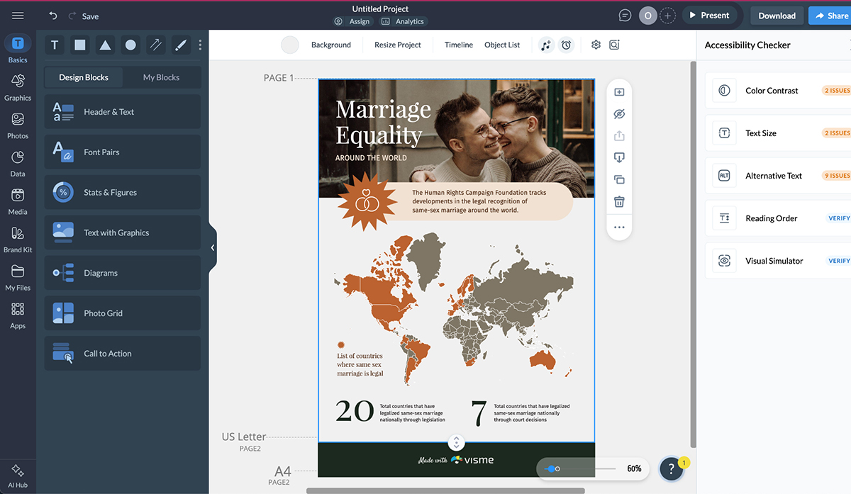 If you’re working on this type of content, Visme can be a good resource. Not only can you check for accessibility inside the editor, you can also create accessible presentations, digital documents, graphics and marketing materials like printable flyers, brochures and posters.