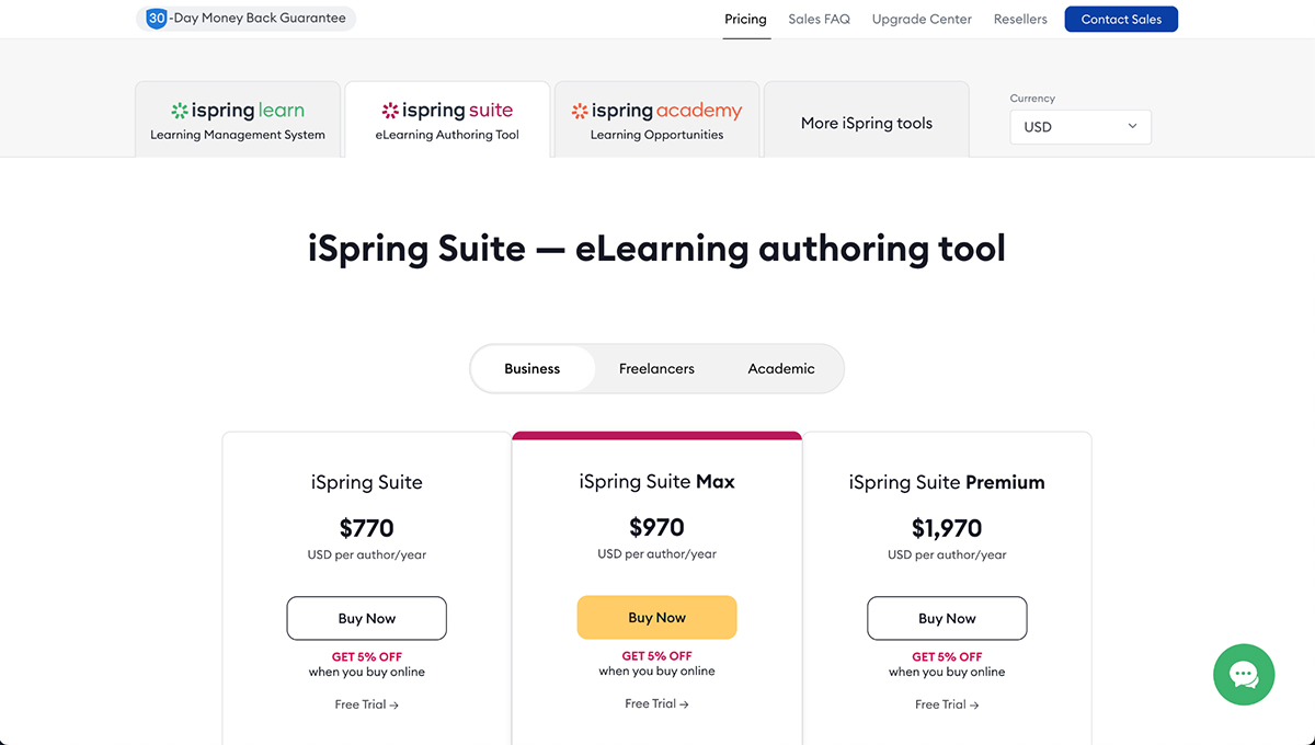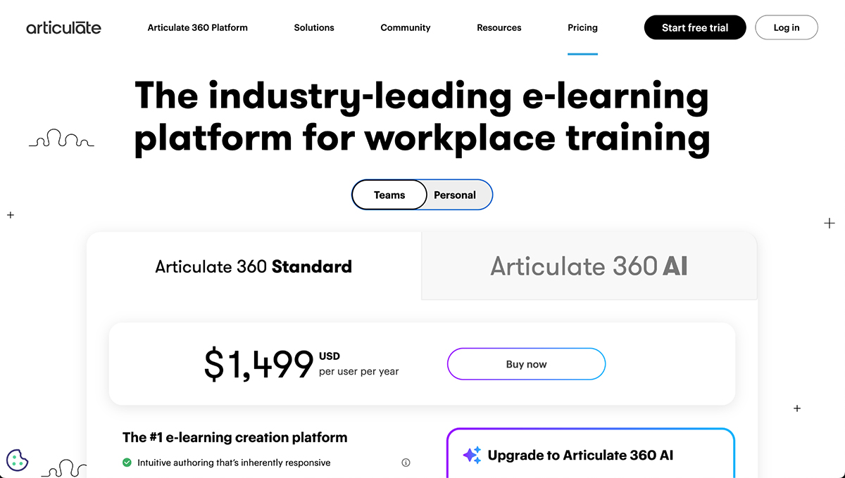 Articulate 360 doesn’t have a free plan; however, users can try out the tool for 30 days. Paid plans are as follows: