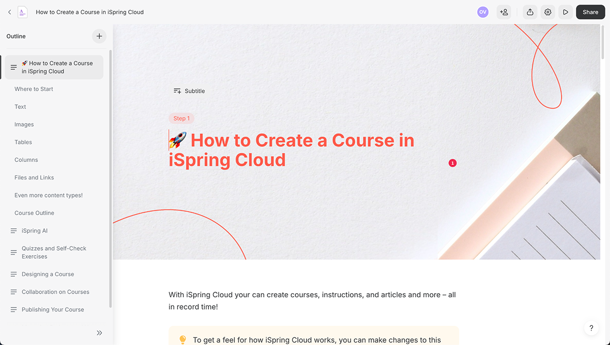 This is what the iSpring Cloud editor looks like with a sample course template.