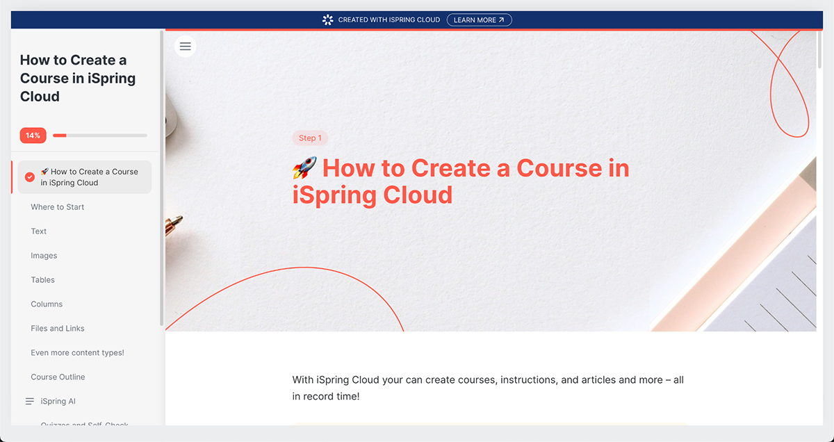 With iSpring Suite, the course is presented as slides. Meanwhile, with iSpring Cloud, the courses are formatted as scrolling pages. Also, iSpring Cloud has a collaborative environment, while iSpring Suite isn’t.