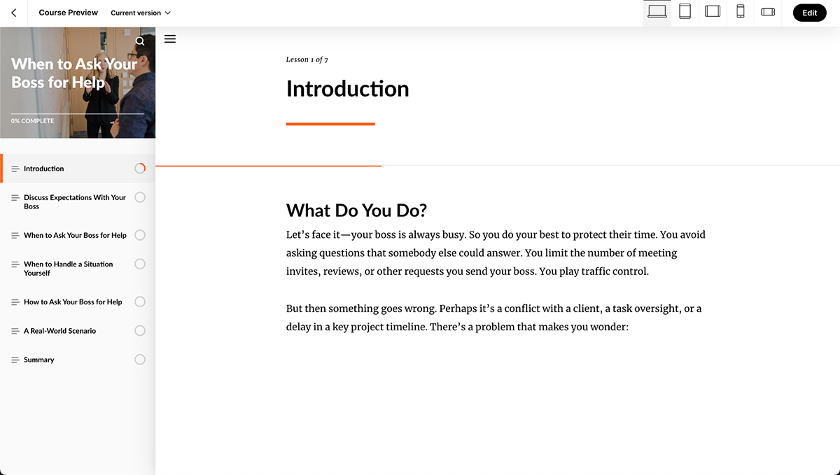 Your designs are automatically responsive, allowing courses to adapt and adjust seamlessly across different devices and screen sizes, including desktops, tablets and smartphones.