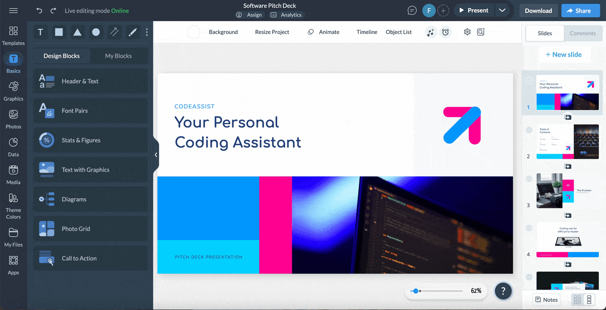 With Visme's robust design platform, creating an impactful agency pitch deck saves you time and money by not requiring a designer or complicated software. Our intuitive tools, AI-powered features, and collaborative workspace make developing presentations super easy, even if you don’t have design skills.