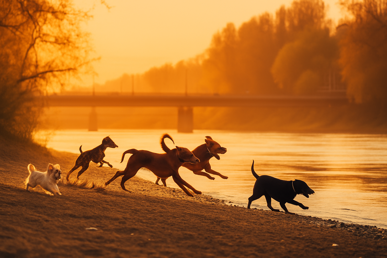 “Golden hour bathes the riverside, illuminating a vibrant scene of playful dogs. A diverse pack joyfully sprints and leaps, their silhouettes dancing against the warm hues of the setting sun. The atmosphere is filled with carefree energy and a sense of timeless companionship, capturing a perfect moment of canine bliss.”