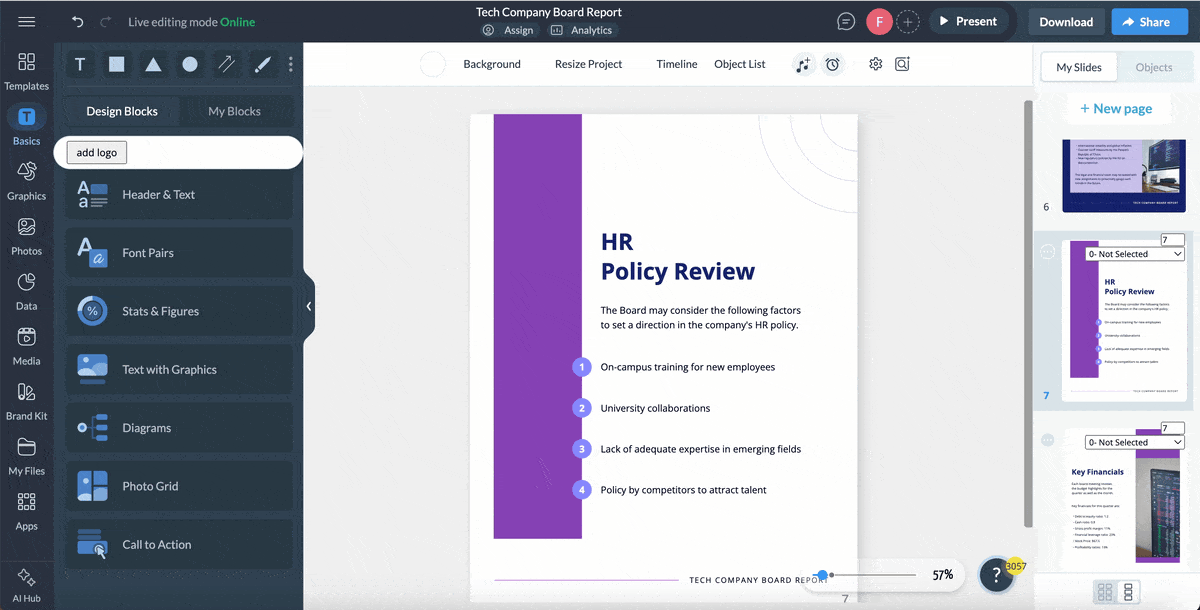 Rather than starting from scratch or juggling multiple tools, Visme gives you everything you need to put together branded board reports in one beautiful, intuitive platform.