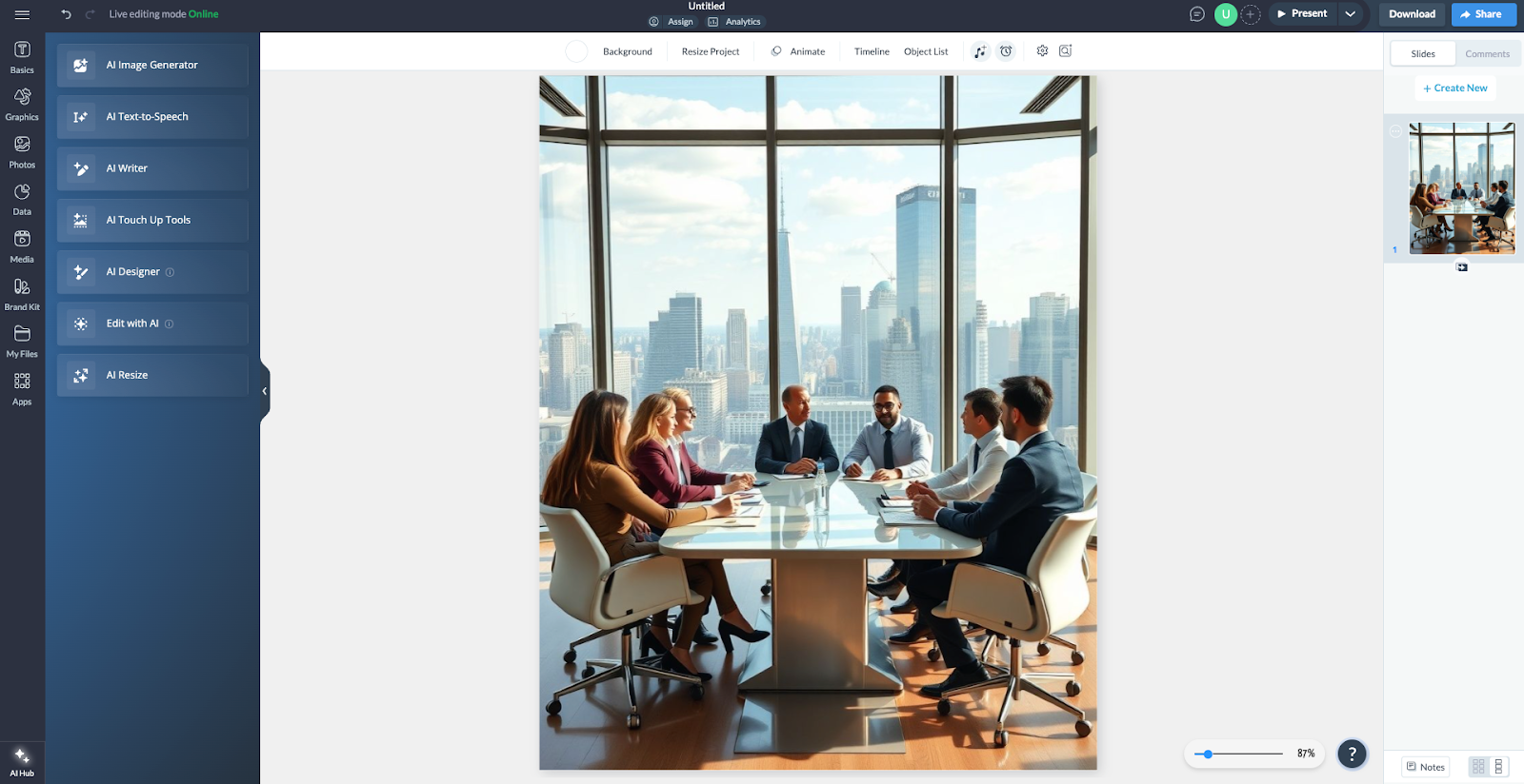 There’s also an AI Image Generator (we covered this more under stock photos) and AI Writer for generating text like headlines, body copy, or even script lines if you're building a presentation.