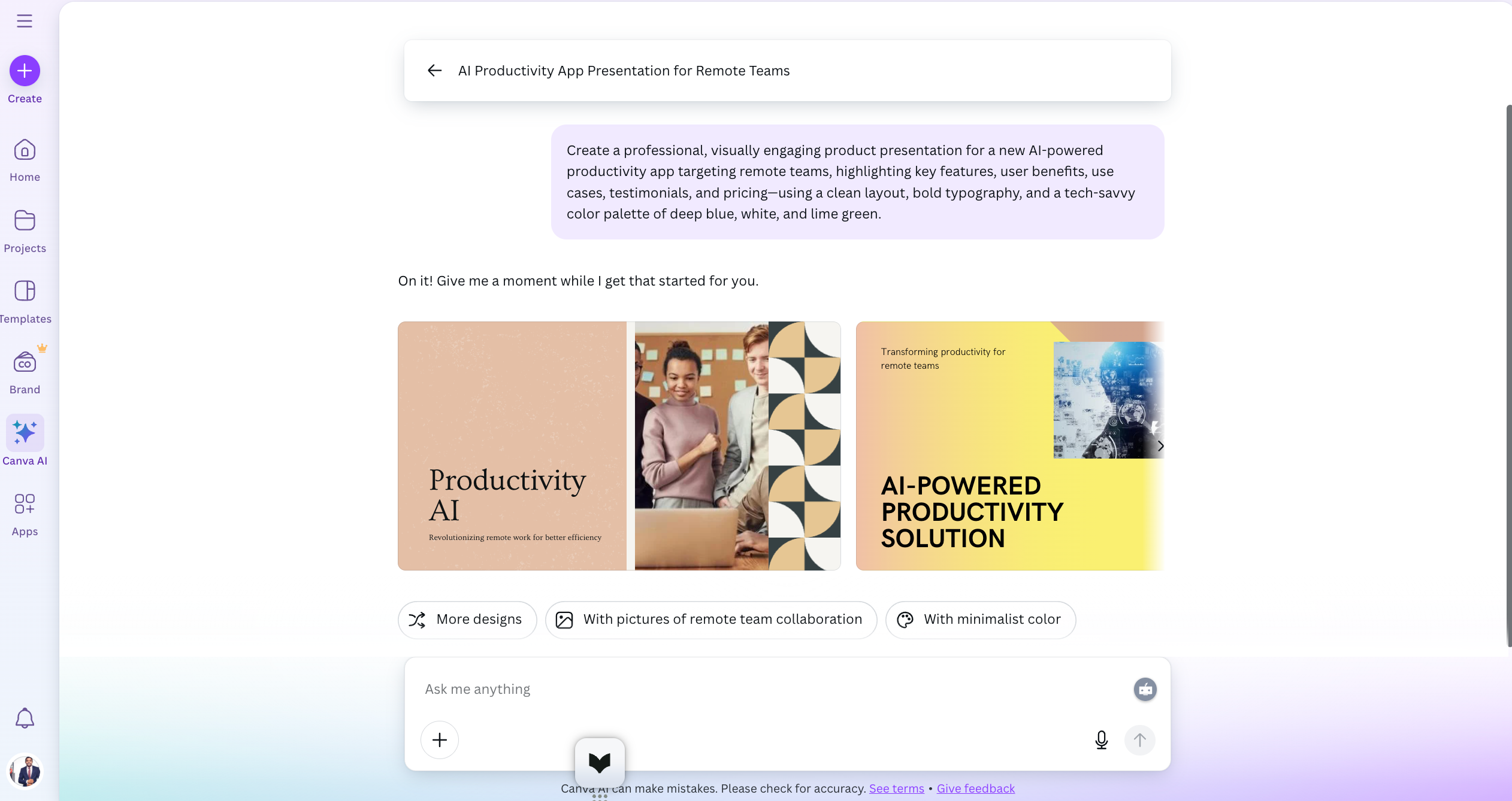 I actually put it to the test using this prompt: Create a professional, visually engaging product presentation for a new AI-powered productivity app targeting remote teams, highlighting key features, user benefits, use cases, testimonials, and pricing—using a clean layout, bold typography, and a tech-savvy color palette of deep blue, white, and lime green.