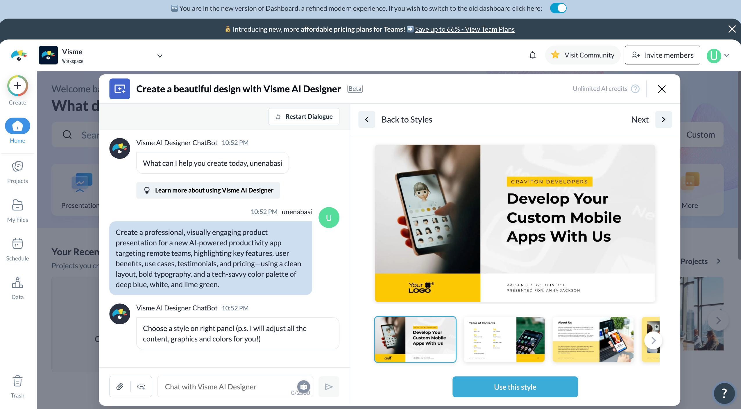 Visme also comes with a mobile app to help you create stunning designs on the go. Download it now for iOS or Android.