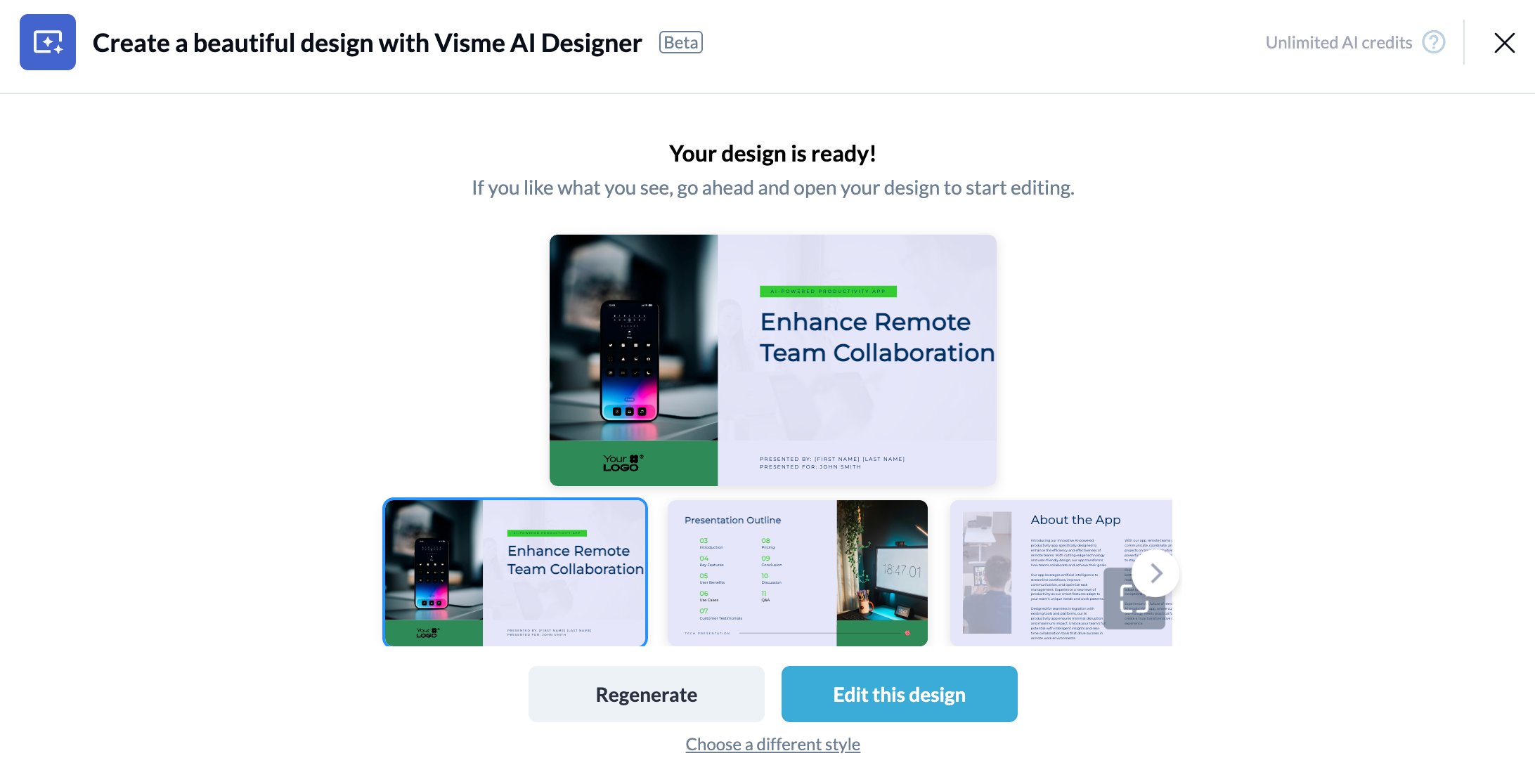 The first draft is pretty impressive, and like Visme, you can scroll to the right for design options. Or you can try out different prompts until you get a good result.