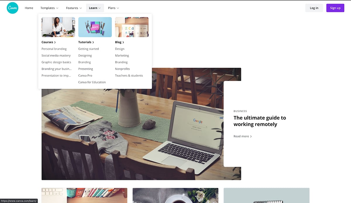 As soon as you land on Canva’s Homepage, you’ll see a learning tab, filled to the brim with educational resources for everyone from marketers to nonprofits to educators to designers to students.
