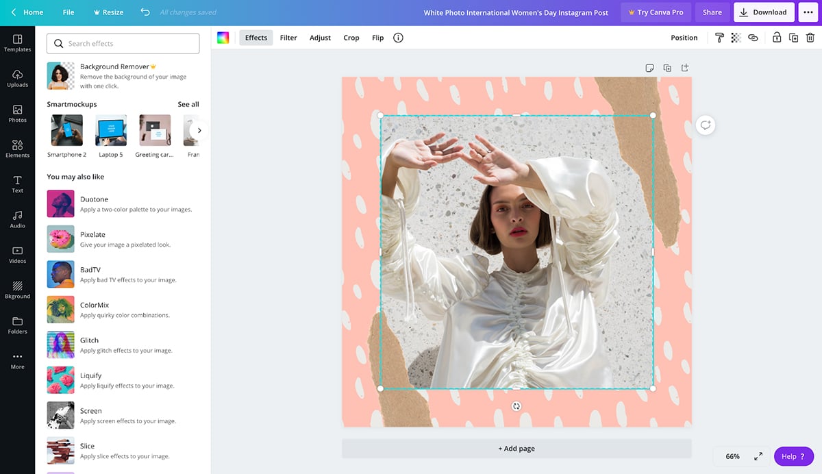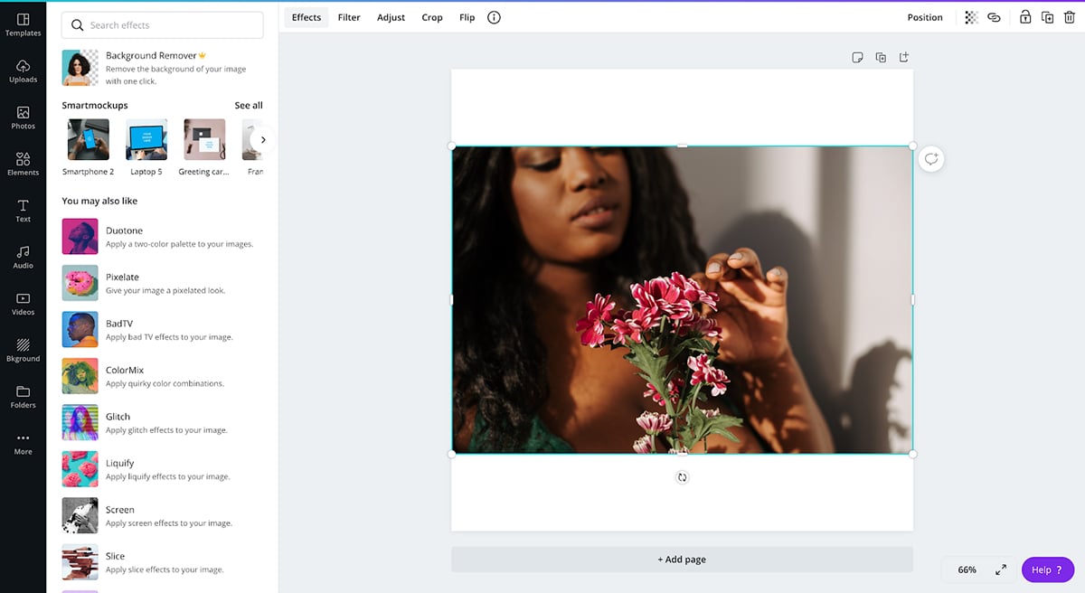 Canva has some tools and features you can use to edit your photos. You can do things such as add a textured background, do basic color grading, crop and rotate your images, liquify elements in your image and remove the background of an image.