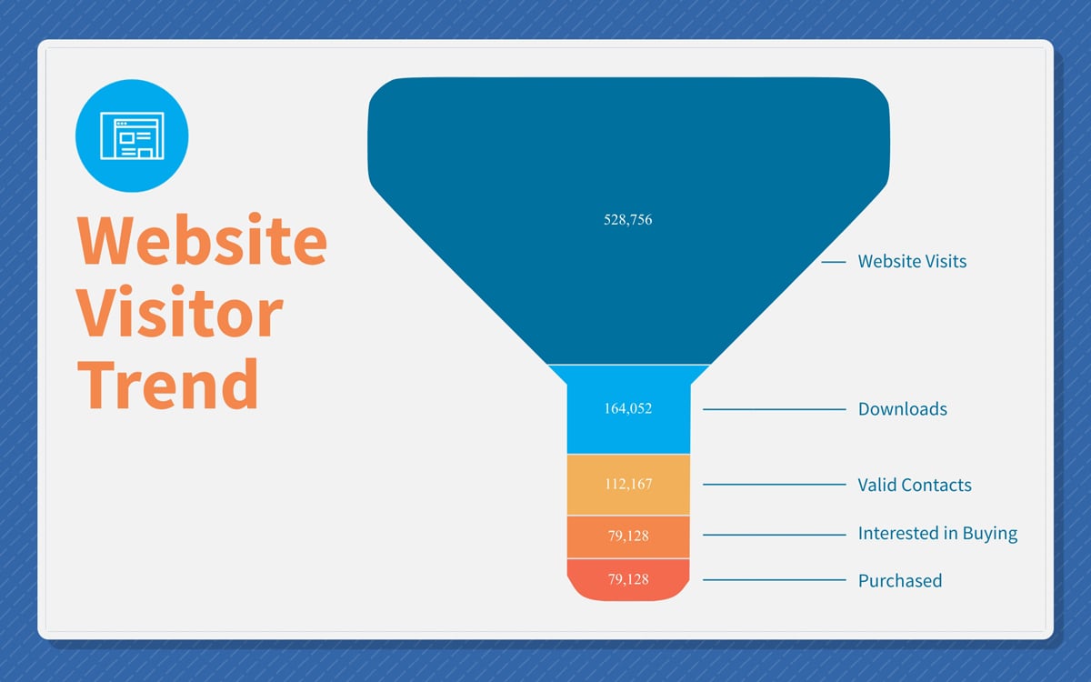 A funnel chart is essentially a pyramid chart upside down. It’s great for visualizing a customer’s journey inside your company, from that first contact to downloads to sales. A funnel chart, like a pyramid chart, can include varying value sets.