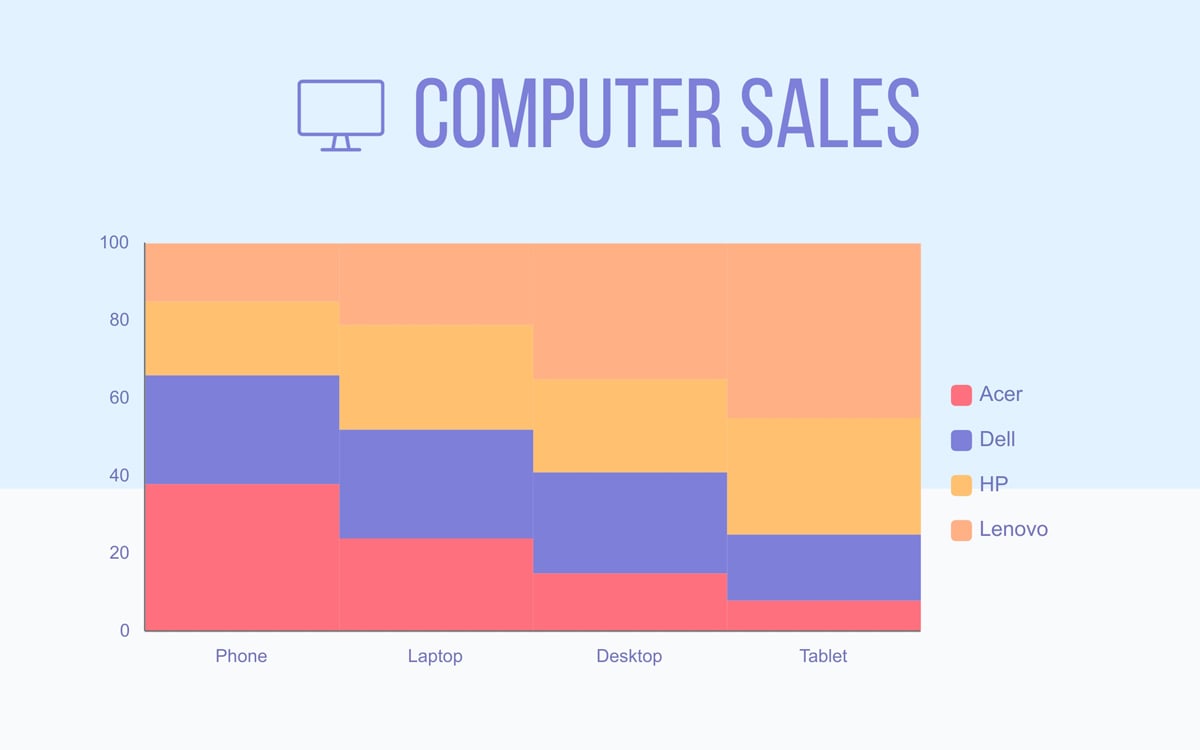 A Mekko chart is similar to a stacked bar chart with an added bonus. The columns have different widths, adding another level of data. In a Mekko chart, the related variables inside the categories are more noticeable.