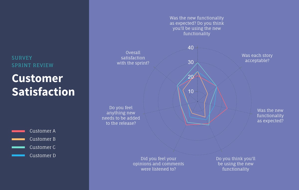 Here's a radar chart template you can customize for better visual impact. It evaluates customer satisfaction during a sprint review based on eight parameters framed as questions.