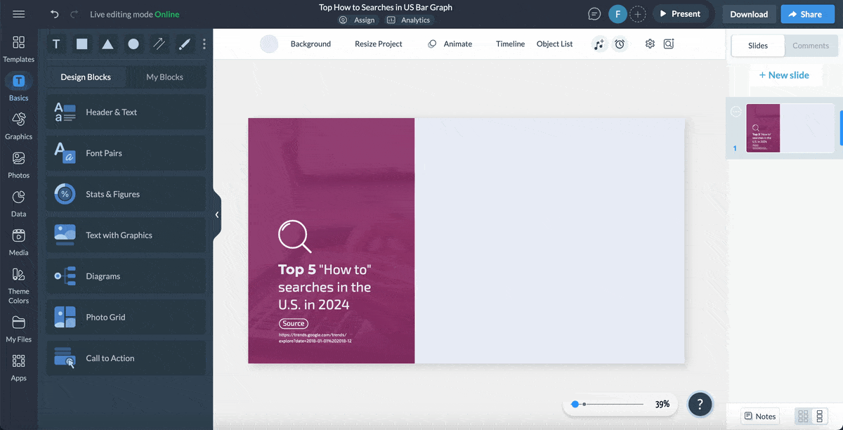 To keep your audience hooked to your presentation, tap into Visme’s wide variety of 2D and 3D widgets to display your data or emphasize specific data points.