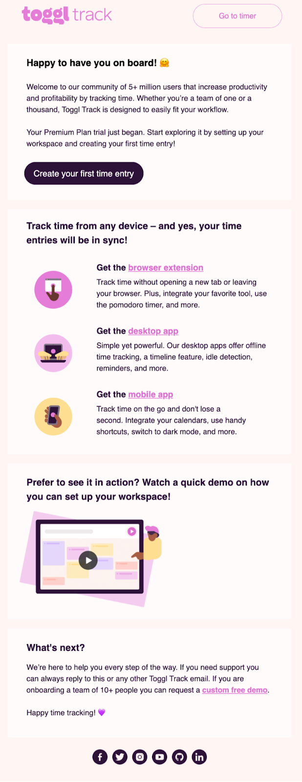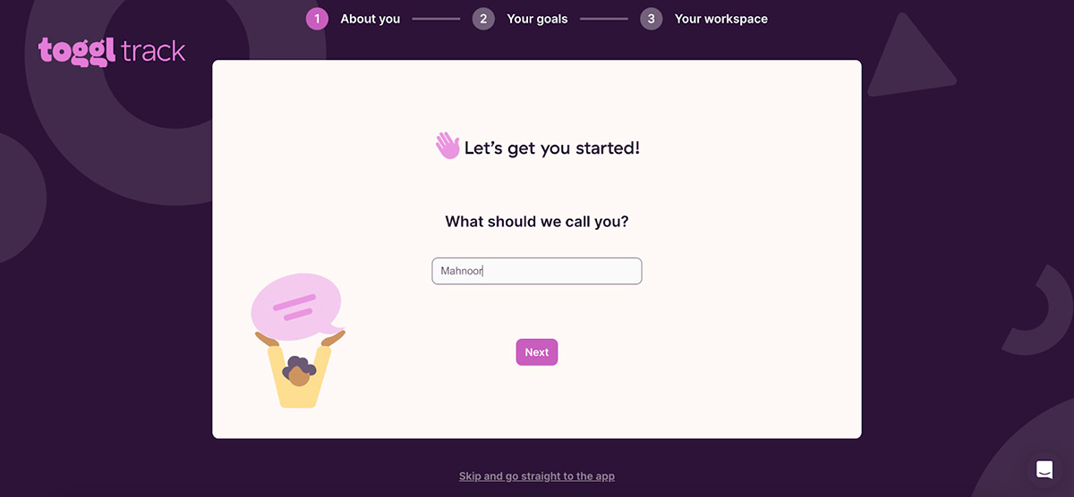 Toggl Track’s onboarding process is interactive, short and helpful. They start off with collecting important information, one step at a time. Essentially, they help new users set up their profiles and customize their workspace without feeling overwhelmed.