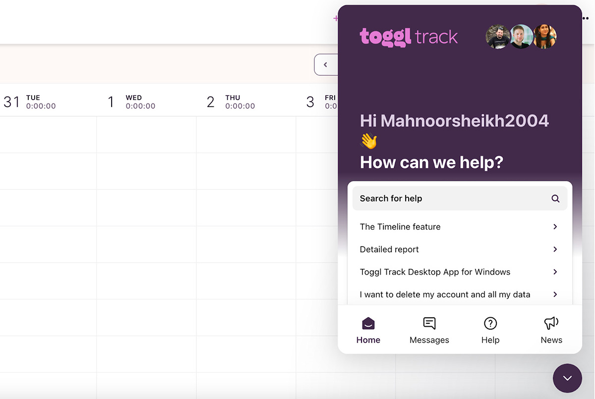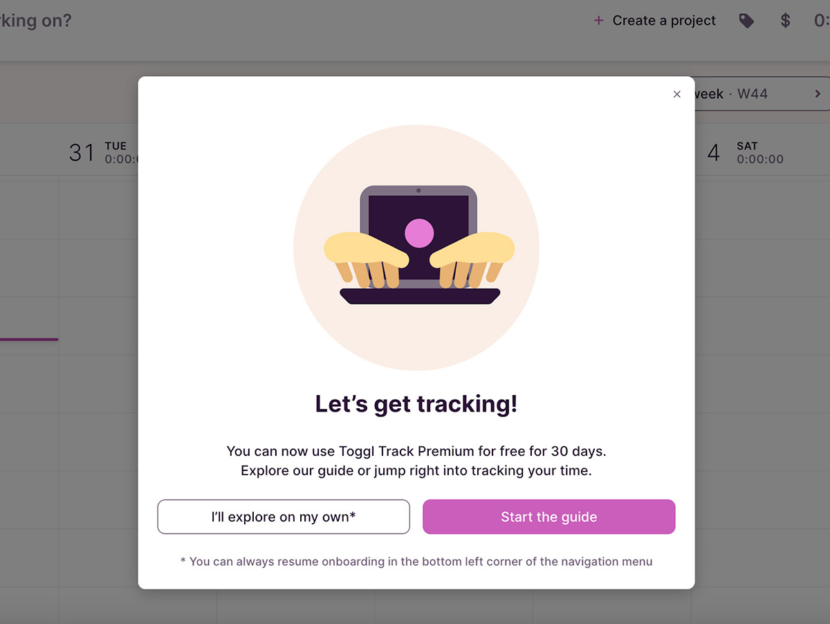 Once they’re set up and good to get started, Toggl Track gives them the option to choose whether they want to go ahead with the onboarding or not. If they accidentally close this window, they can resume onboarding from their workspace.