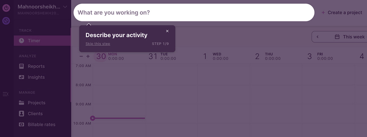 The onboarding process starts with a mandatory task completion that takes users step by step. By the end of this short “training,” users are already familiar with how the tool works, the important buttons and how to use it to track time.