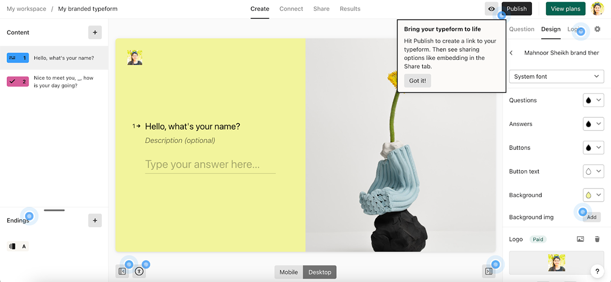 If you start from scratch, you’re taken to the main workspace or ‘form builder.’ This can be overwhelming, but Typeform makes it easy for users to get acquainted with the help of blue, animated hotspots that expand into tooltips when you click on them.