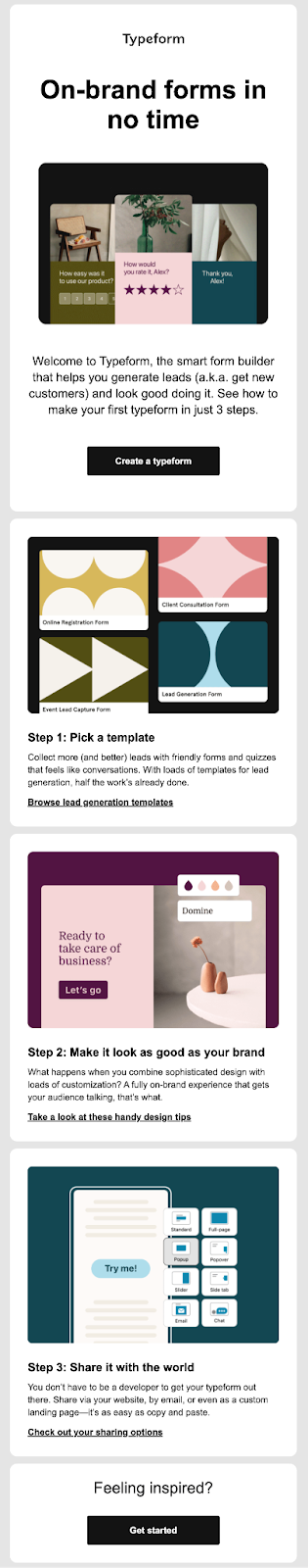 Typeform also sends a helpful welcome email that guides new users on how to get started in three steps: