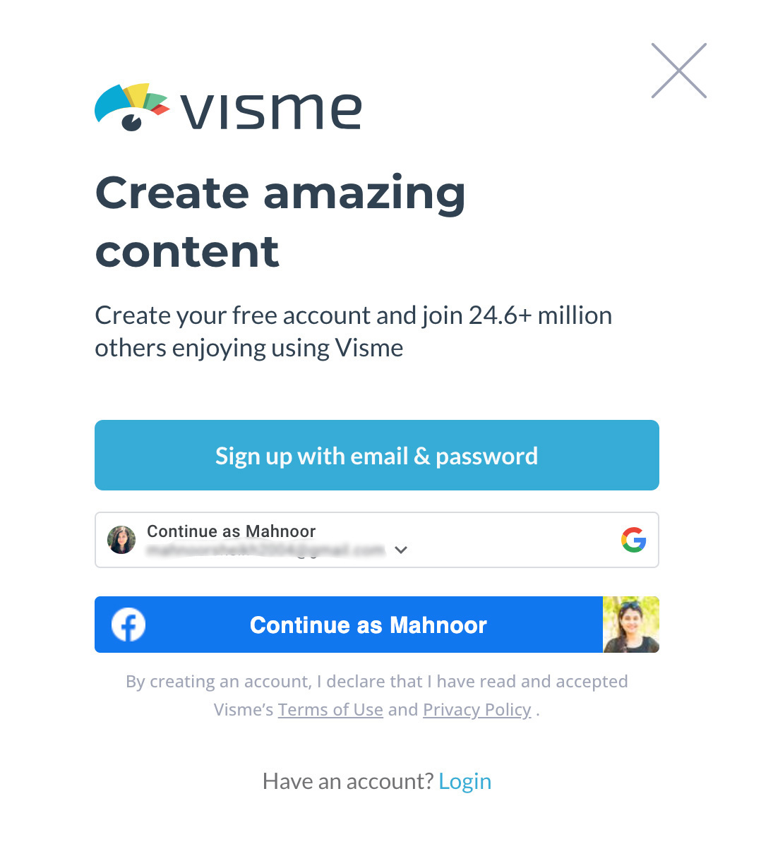 Also, it helps if you offer multiple ways for users to sign up. For example, you can sign up for Visme via email, Google or Facebook.