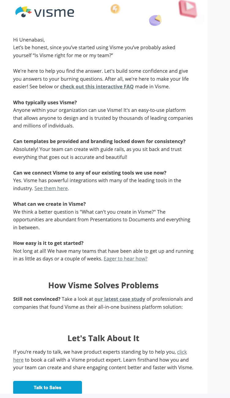 Visme's approach to customer onboarding is a standout model of customization and adaptability. We start with a unique Customer Success (CS) plan for each user, pinpointing specific goals, pain points and use cases.