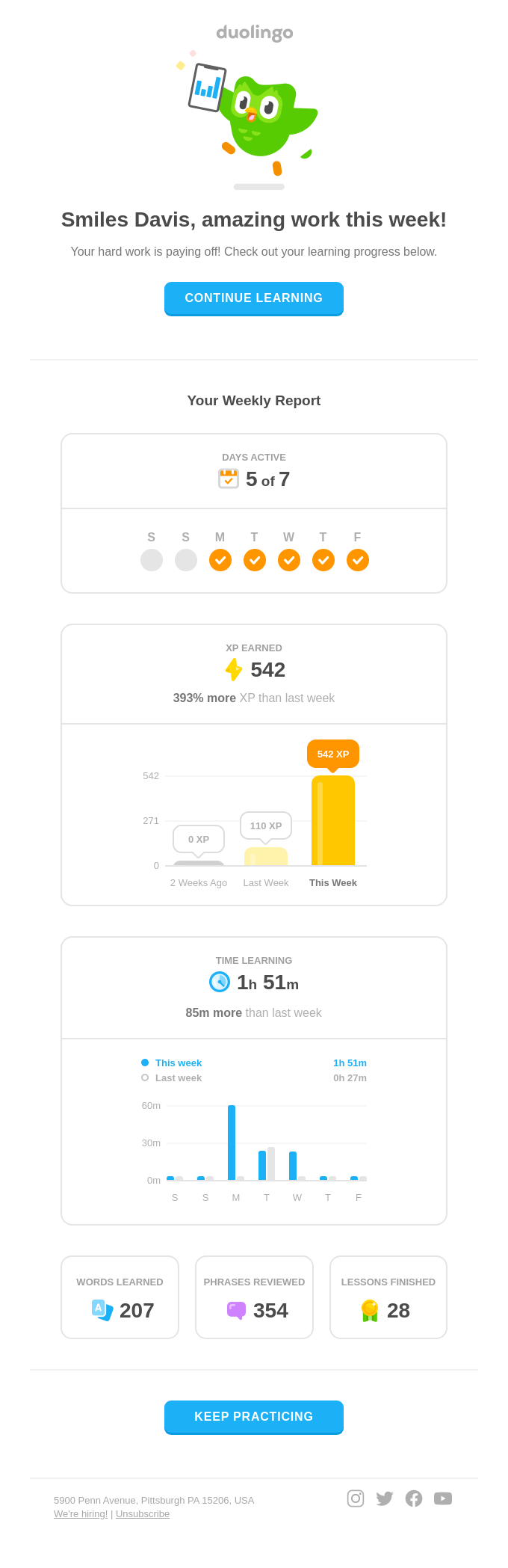 For example, Duolingo sends weekly progress reports to users, congratulating them on their achievements and encouraging them to practice more.