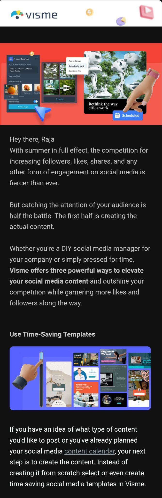 Here's one of the email design examples from Visme that demonstrates the effective use of images in our email design:
