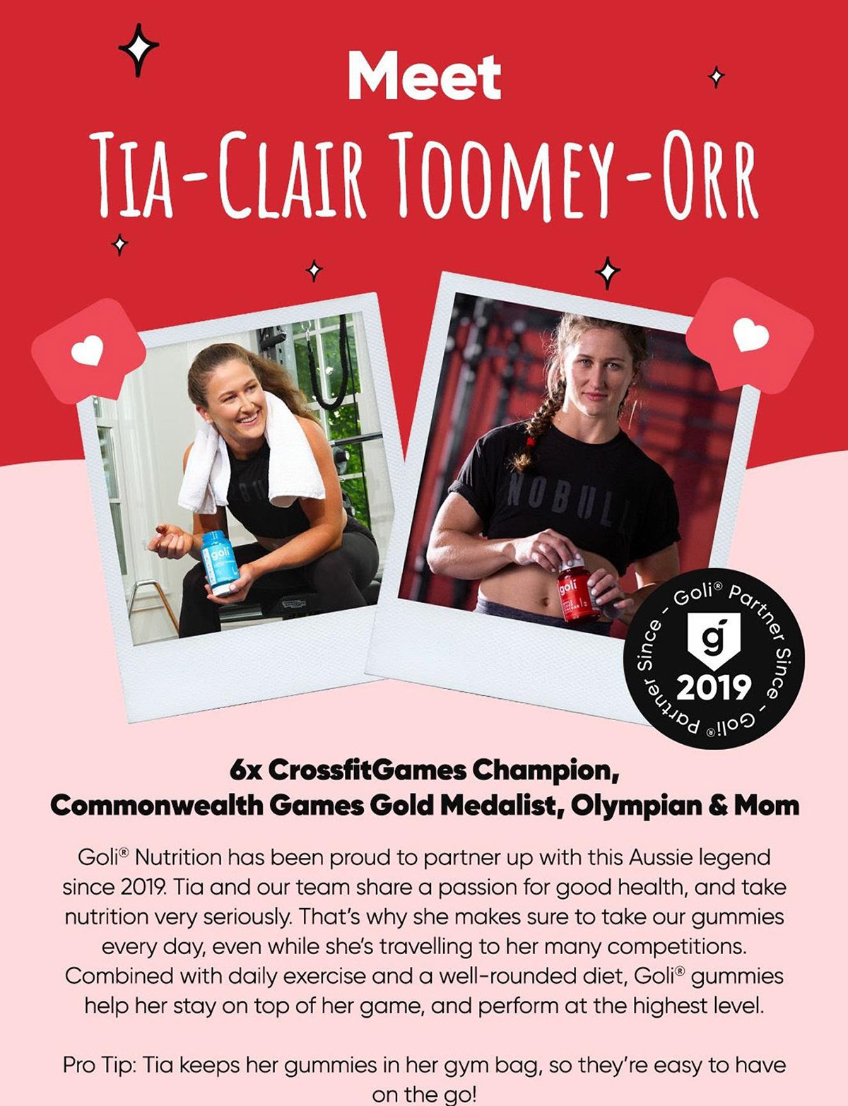 This email example is from gummy vitamin brand Goli, where they showcase Tia-Clair Toomey-Orr, 6X Crossfit Games Champion and a Goli Partner since 2019.