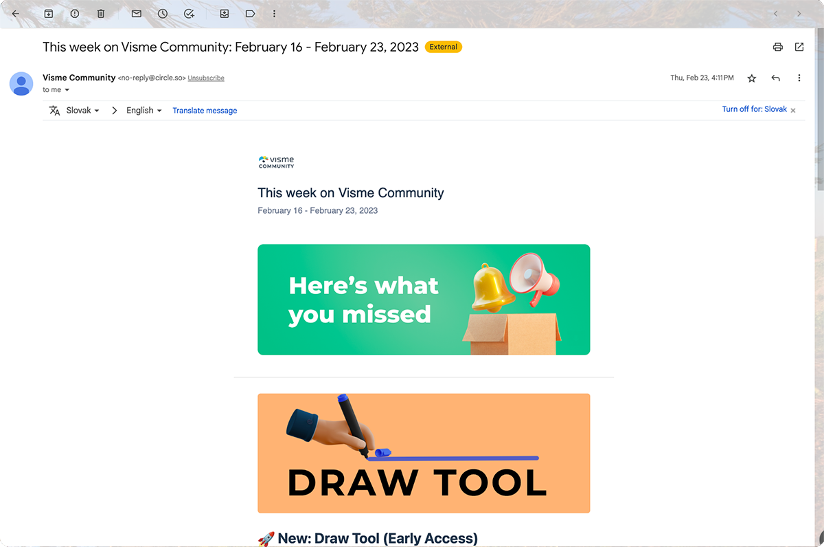 The example below is a What’s New email from Visme. Every two weeks, we announce new features and send out an email to let everyone know about them.