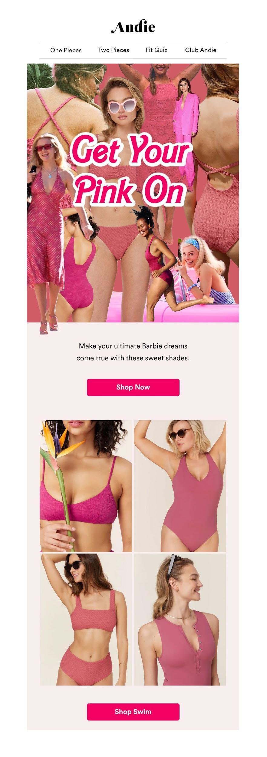 The example below is an email campaign from a viral swimsuit brand, Andie. They chose all their pink products and created a collage of movie stills and pink swimsuits, and added a “Get Your Pink On” header in a Barbie font.