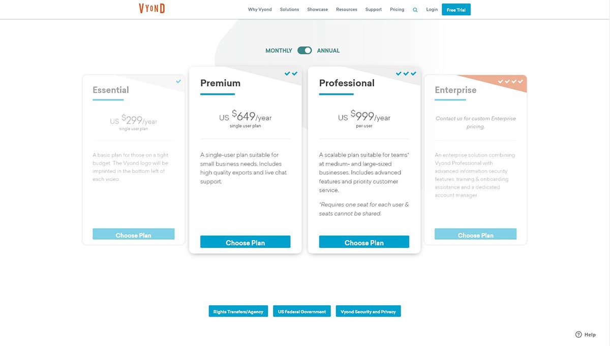 Vyond no tiene una cuenta gratuita, pero ofrece una versión de prueba gratuita con la mayoría de las funciones para que pueda probar y conocer el software.Tampoco se pueden comprar planes mensuales ya que la plataforma sólo funciona con planes anuales.
