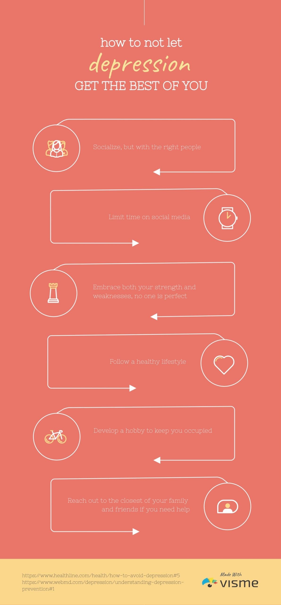 La depresión es una enfermedad grave, pero es posible que muchos estudiantes no conozcan las mejores formas de combatirla. Crear una lista de formas en que los estudiantes pueden combatir la depresión puede alentarlos a tomar medidas. Además, presentar la información de manera atractiva hace que sea más probable que la vean dos veces.