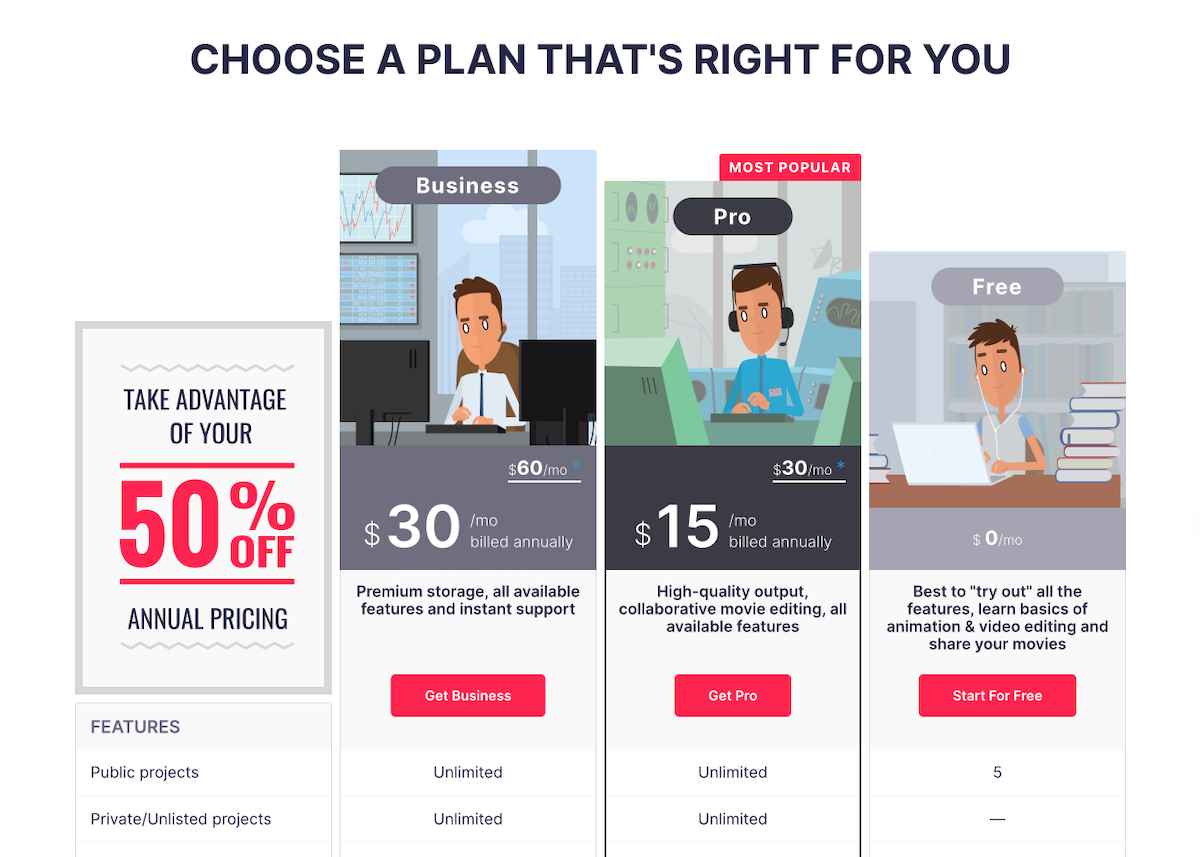 The free Animaker plan is enough to get to know the tool and all it has to offer. You can download five projects with a watermark and a few other things. Paid plans have much better options.