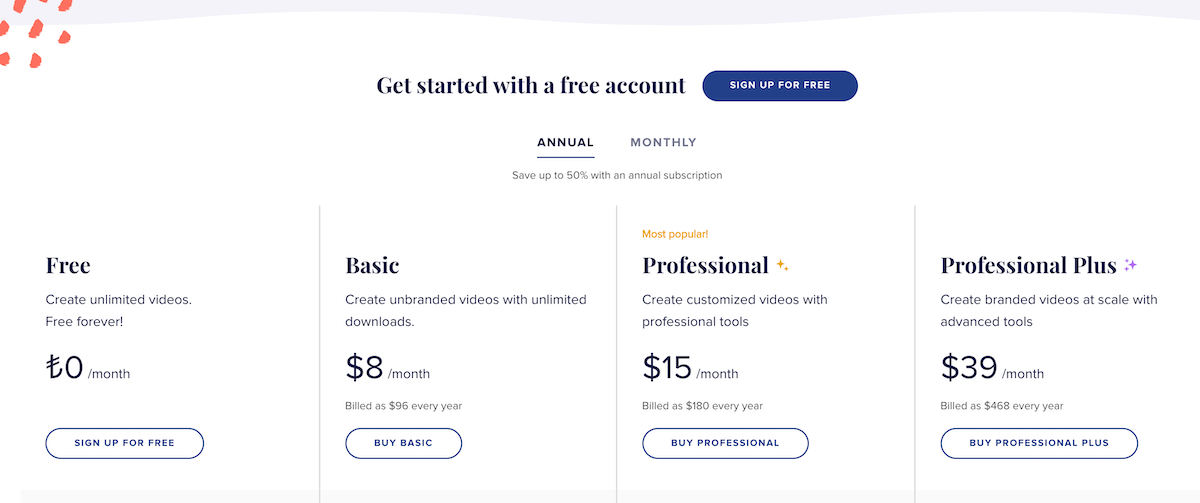 Animoto offers flexible pricing plans, and they are also relatively more affordable than most other tools. The free plan is good, but it comes with Animoto branding on your videos.