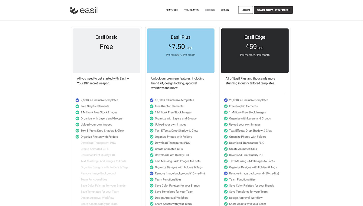 Easil a un total de trois forfaits. Leur premier forfait est 100% gratuit et comporte des fonctionnalités limitées. Le forfait + propose des fonctionnalités supplémentaires à 6,25$ par mois. Le forfait Edge comprend toutes les fonctionnalités disponibles à 49$ par mois.