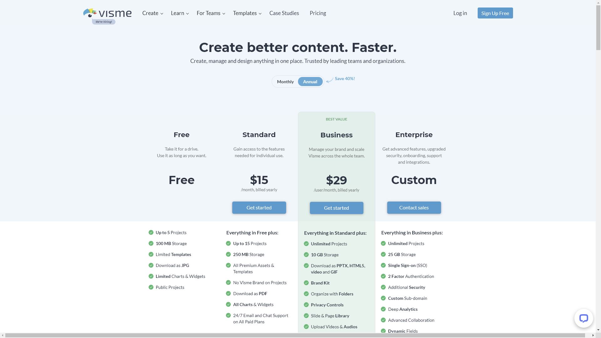 Tout d’abord, vous pouvez créer un compte entièrement gratuitement. Visme a créé ce compte gratuit pour vous aider à traduire un superbe design dans votre marque. De plus, la version gratuite vous permet d’essayer l’outil avant de décider d’acheter.