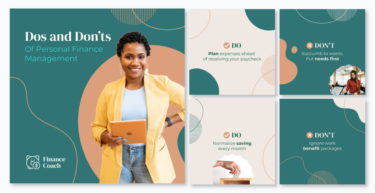 Si vous souhaitez créer une annonce multi-photos ou une annonce carrousel, assurez-vous que chacune de vos images ou graphiques s'écoule bien d'une photo à l'autre. Pour ce faire, vous pouvez notamment utiliser un modèle ou un format graphique similaire pour chaque image, comme celui ci-dessous :