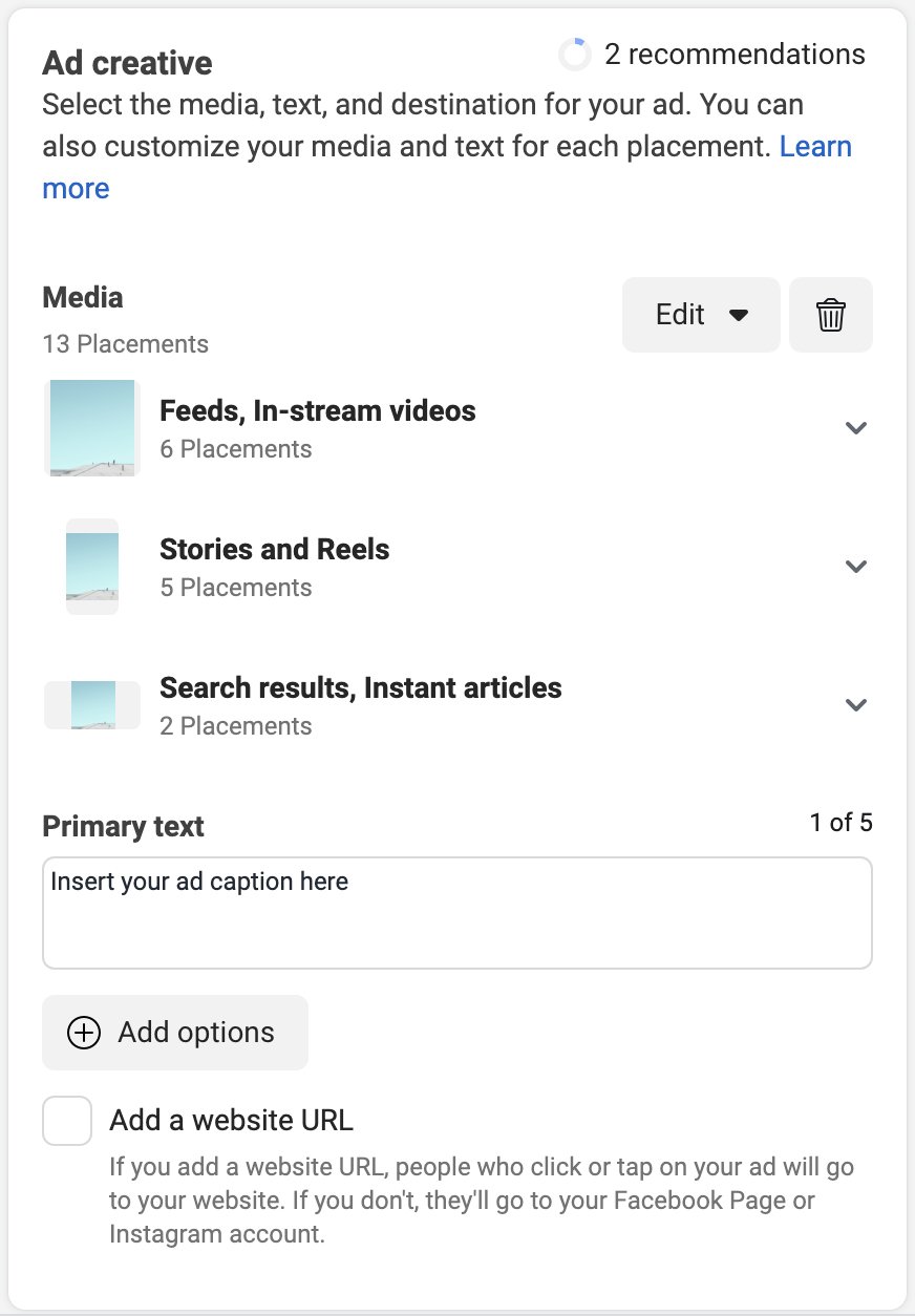 Vous pouvez choisir plusieurs emplacements pour vos annonces à la fois, bien que vous ne souhaitiez peut-être pas le faire en fonction du côté de votre création publicitaire. Par exemple, les annonces destinées à apparaître dans le feed n'auront pas le même attrait si vous les placez également en tant qu'annonces Stories.