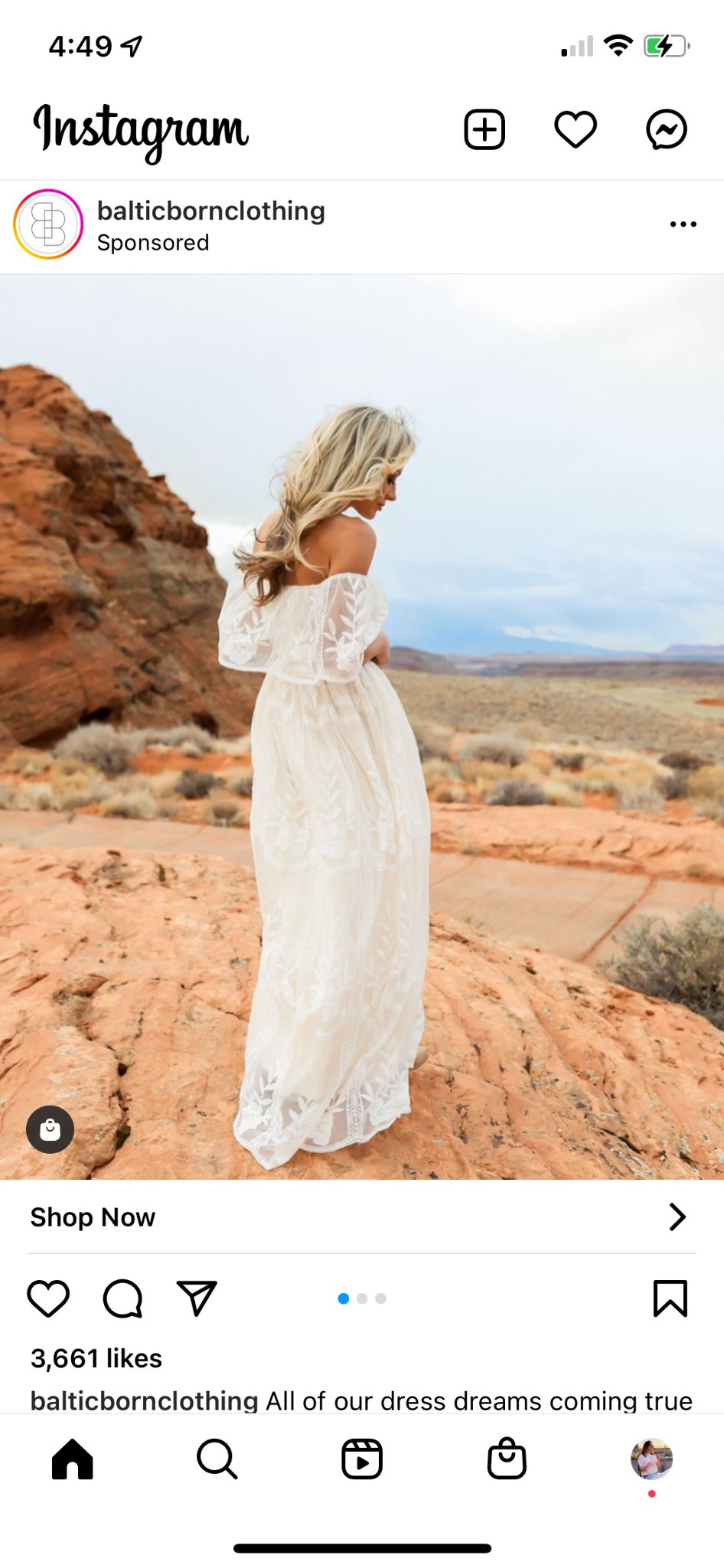 Comme nous le voyons dans cette annonce de Baltic Born Clothing ci-dessous, vous pouvez également lier des produits directement à vos annonces. Alors que le CTA "Acheter maintenant" et le lien mènent sur le site, nous pouvons voir l'icône du panier dans le coin inférieur gauche qui nous indique qu'ils ont également lié un produit dans leur boutique Instagram à l'annonce.