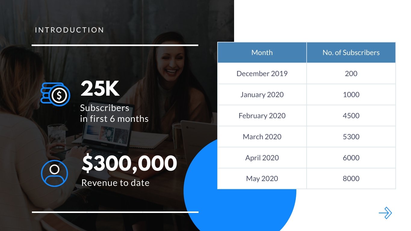 Point clé à retenir : En tant que startup, vous n'avez pas toujours besoin de disposer d'informations financières pour étayer votre idée. Si vous n'avez pas actuellement de données sur les revenus à présenter, vous pouvez toujours présenter des arguments solides avec des statistiques d'utilisation, d'engagement et d'audience qui montrent un potentiel de croissance.