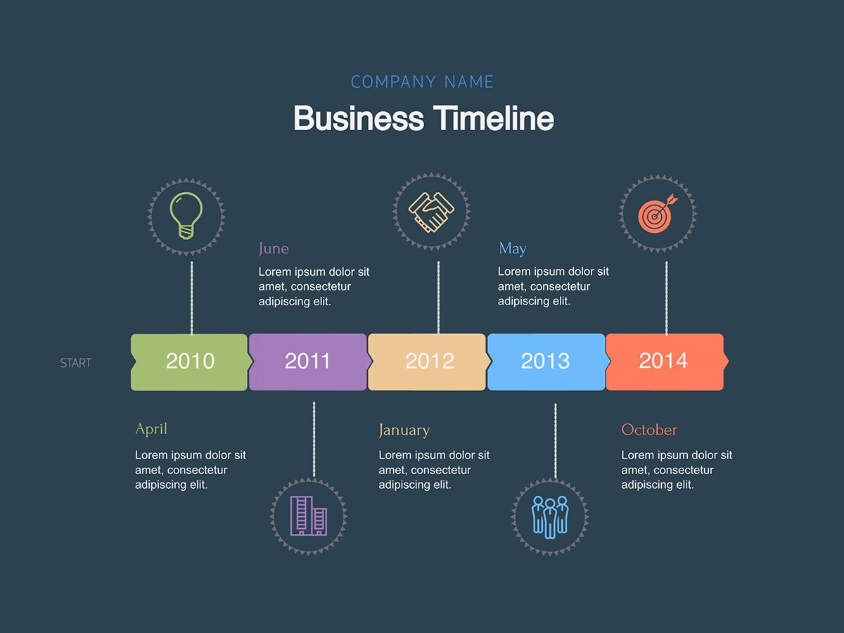 Les chronologies sont des visualisations qui montrent les événements qui se sont produits ou se produiront sur une période spécifique. Utilisez ce type de data visualisation pour des rapports d'information sur des sujets avec une histoire ou pour visualiser l'histoire de la croissance d'une entreprise. Vous pouvez également utiliser une chronologie pour expliquer un plan ou un objectif pour un projet.