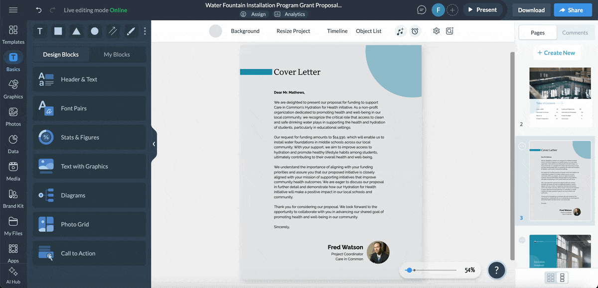 The cover letter sets the stage nicely. It shares the organization’s mission and makes a strong case for why clean drinking water can make a real difference in a middle school setting.