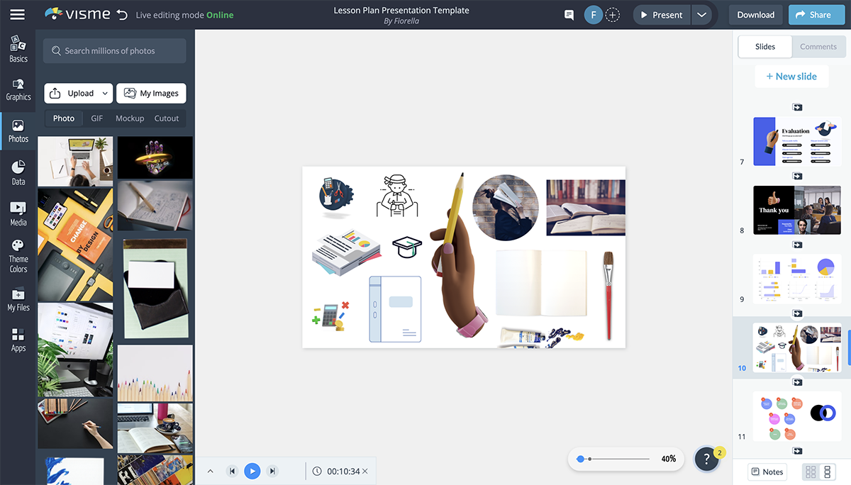 One of the biggest challenges of creating presentations is designing them to look professional and visually appealing. Visme solves this problem by offering a vast library of design elements to add to your PDFs and slides with just one click.
