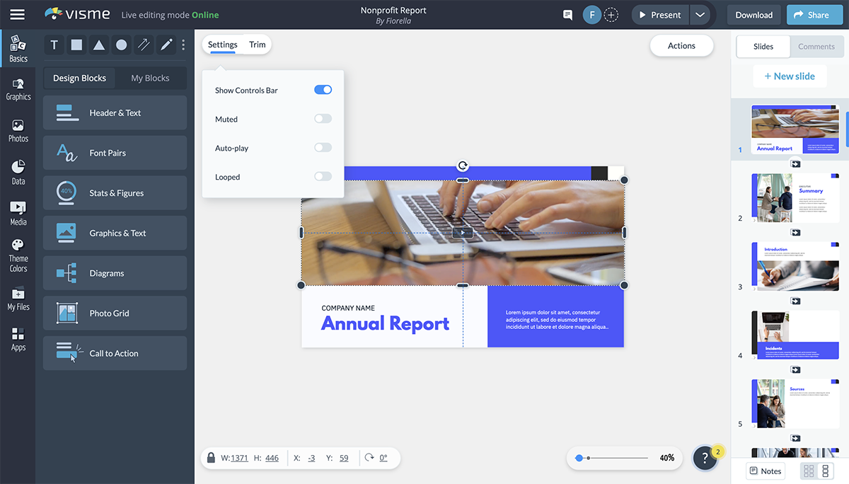 The easy-to-use drag-and-drop interface in the Visme editor makes video creation easy and fast. All elements from the left toolbar can be dragged onto the canvas and placed easily on the slides.