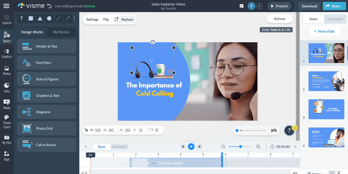 As soon as you add an animated element or action to a project, the editing timeline appears at the bottom of the canvas. Every slide (or scene) in your video has its own timeline. With the editing timeline, you can control every animated element, video and transition to the next slide.