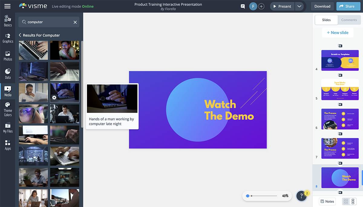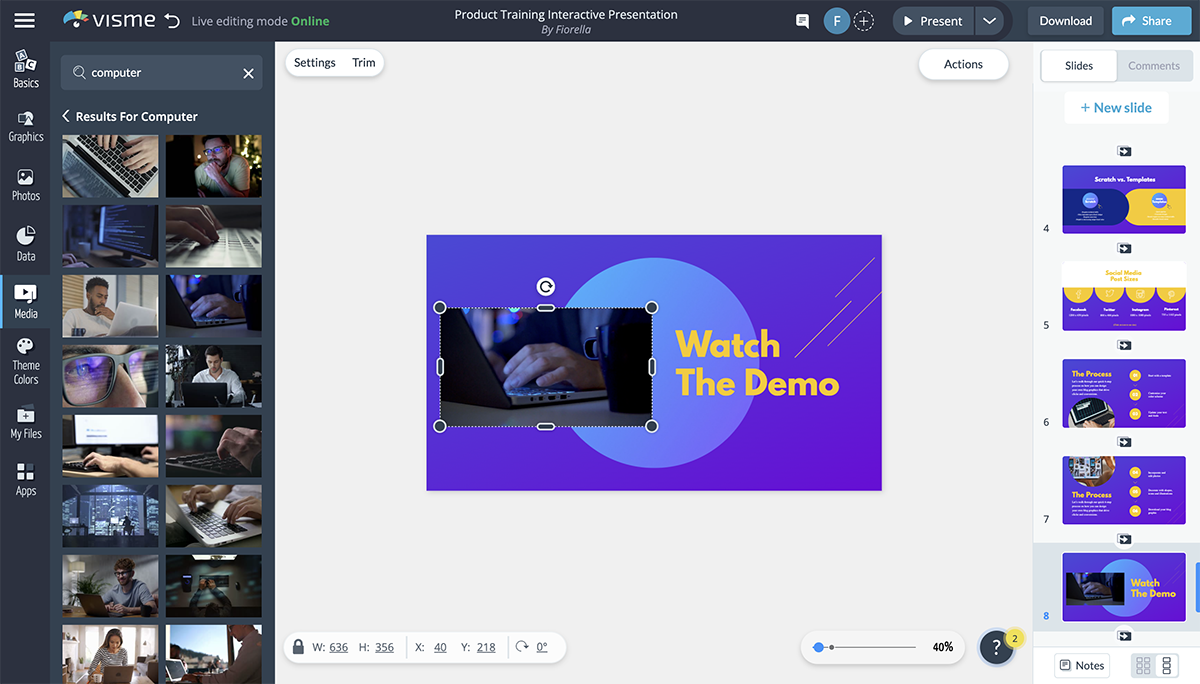 Adding videos to your presentations in Visme is easy. There are three ways; adding stock video, uploading from your computer and embedding online videos.