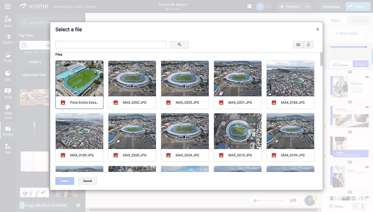 Sometimes, 4 million stock videos aren’t what you need, especially if you have to follow branding guidelines and have a repository of in-house production videos. In this case, you can upload videos to your Visme Media Library and have them on hand for all future projects.