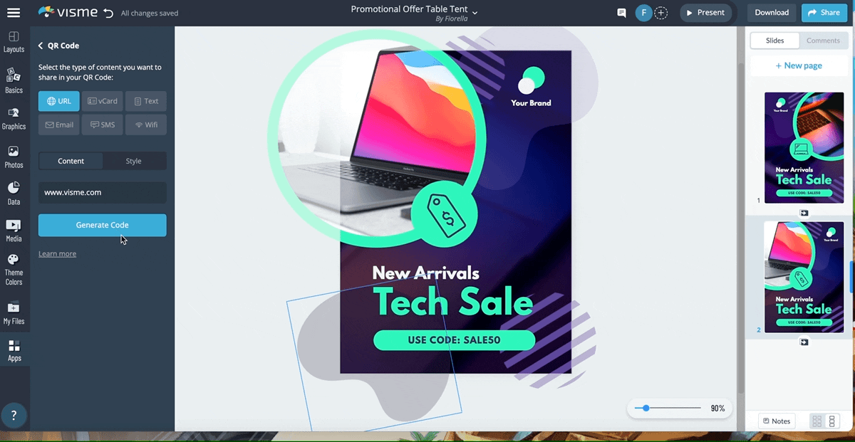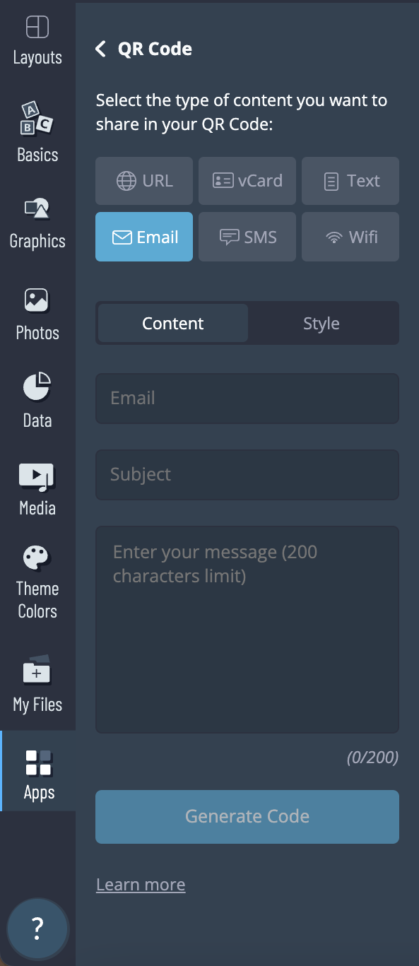 Now, it’s time to create the code with the information you want to tie to it. With the final design ready, navigate to the Apps tab on the left toolbar and scroll down to the QR code generator.
