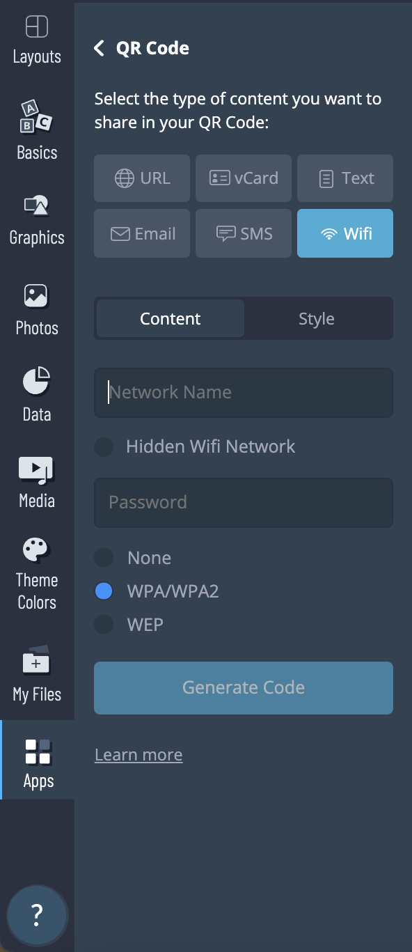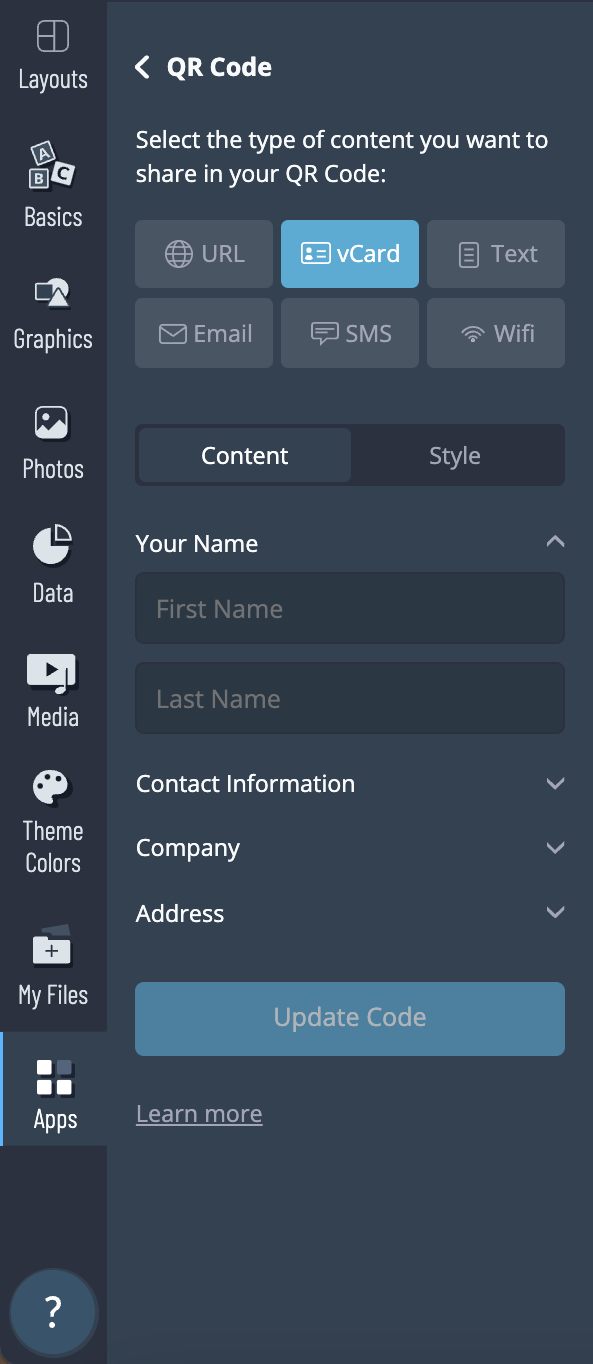 Visme's QR Code generator has a number of options for the type of information you add to it. Let’s take a look at each one.