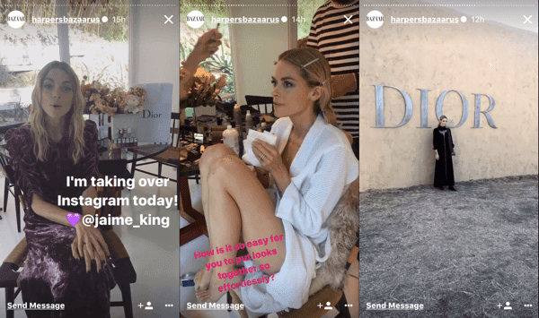 It can lead to a lot of fresh, unique content and followers as the influencer’s followers will follow you. An example is this one where @jaime_king took over the @harpersbazaarus account.